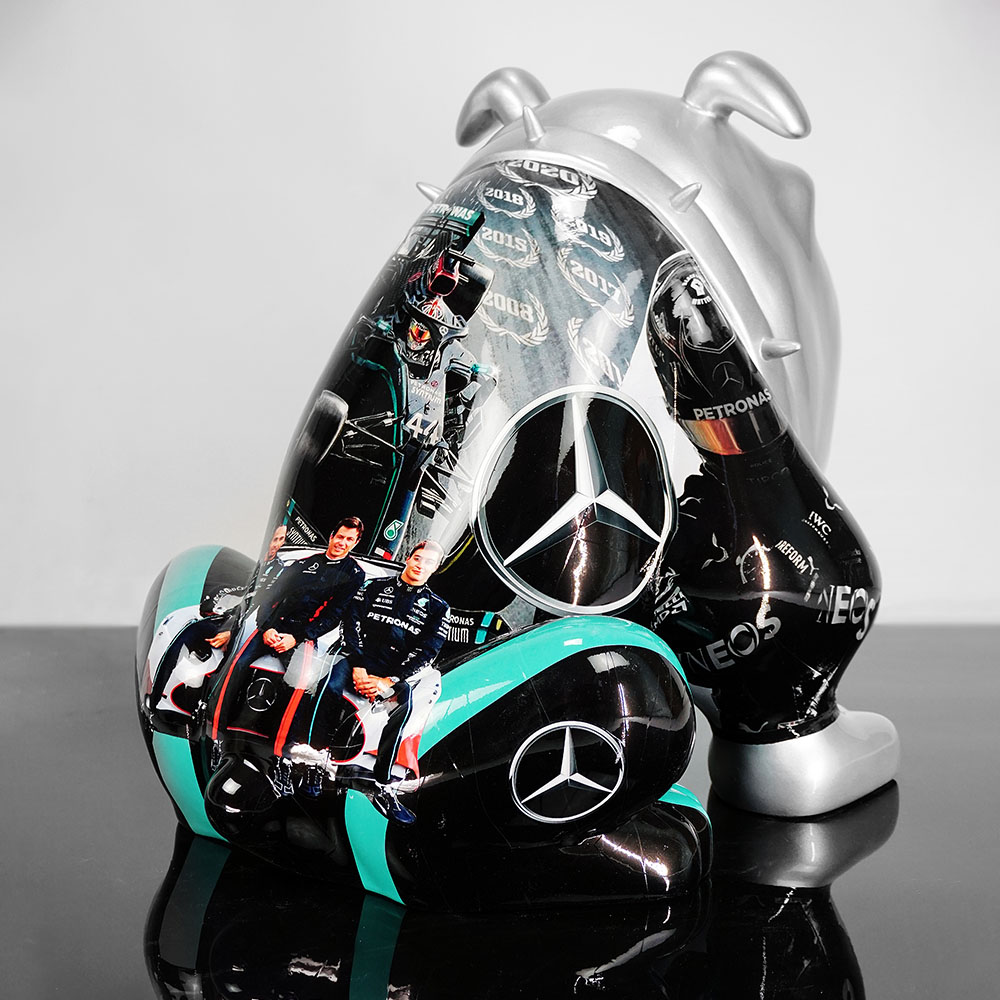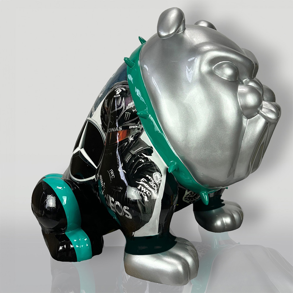 Chien bulldog Avella réalisé avec la technique du film adhésif dans le style de Mercedes avec la couleur Petronas.