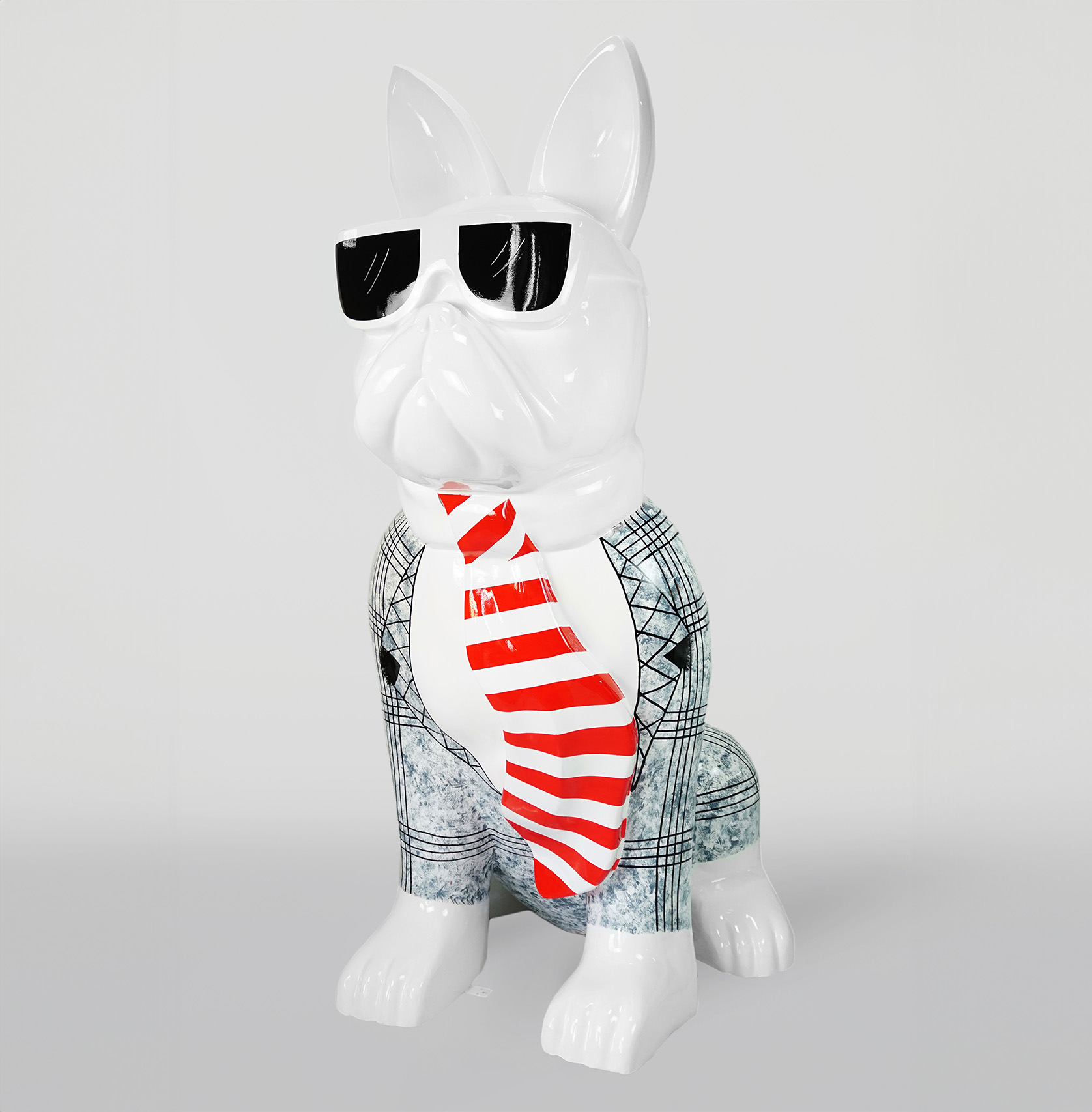 Grande figurine de bouledogue avec cravate et lunettes, laquée – peinte à la main avec un motif de veste à carreaux.