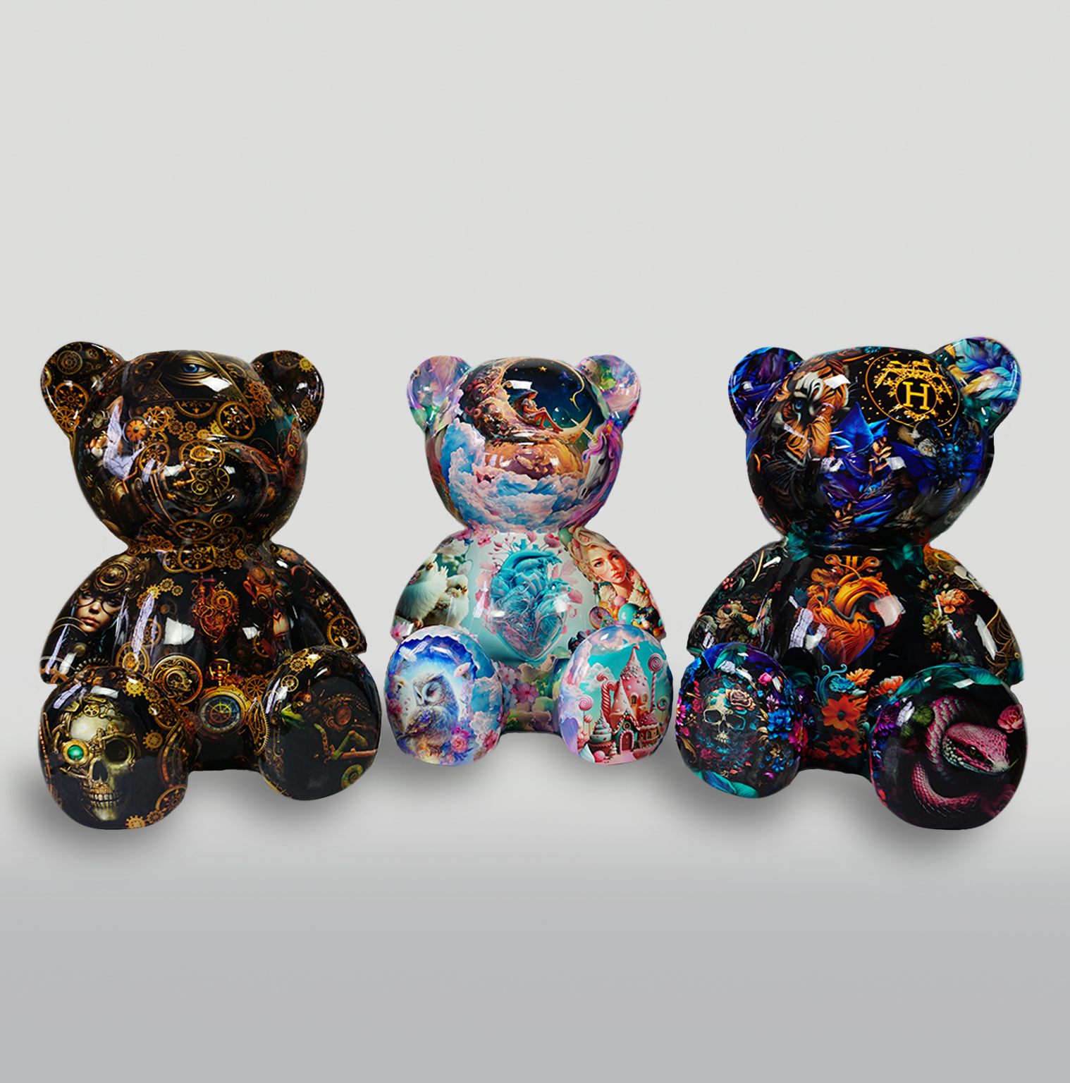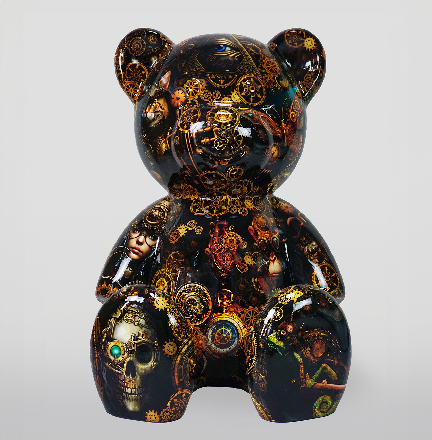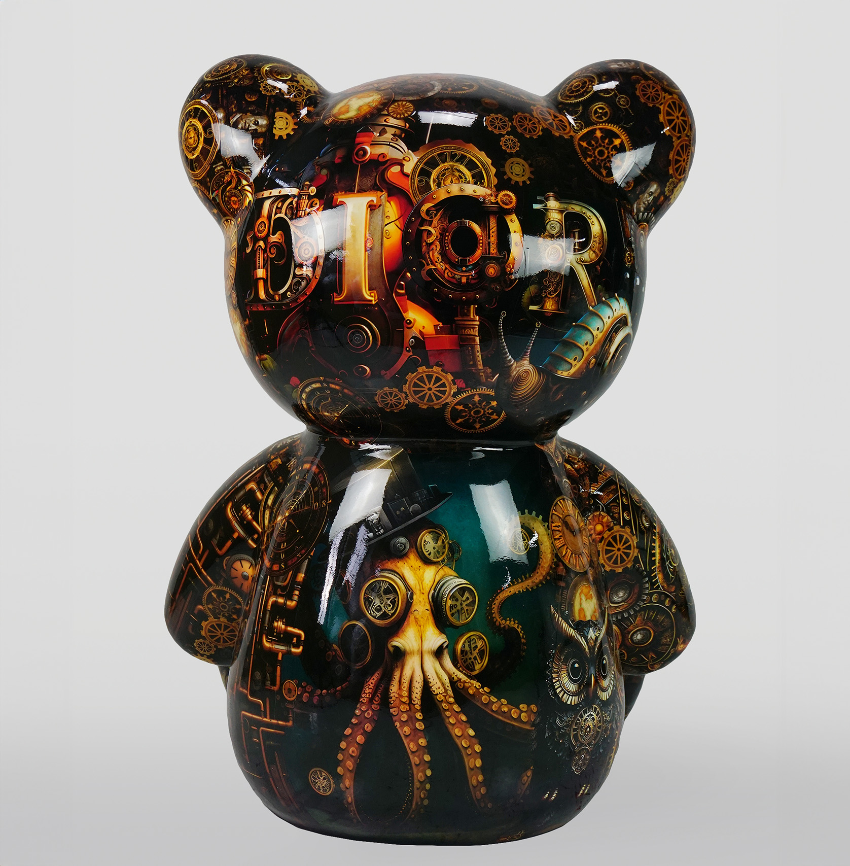 Grand ours assis avec un motif industriel, fabriqué en utilisant la technique de l’enveloppement de film