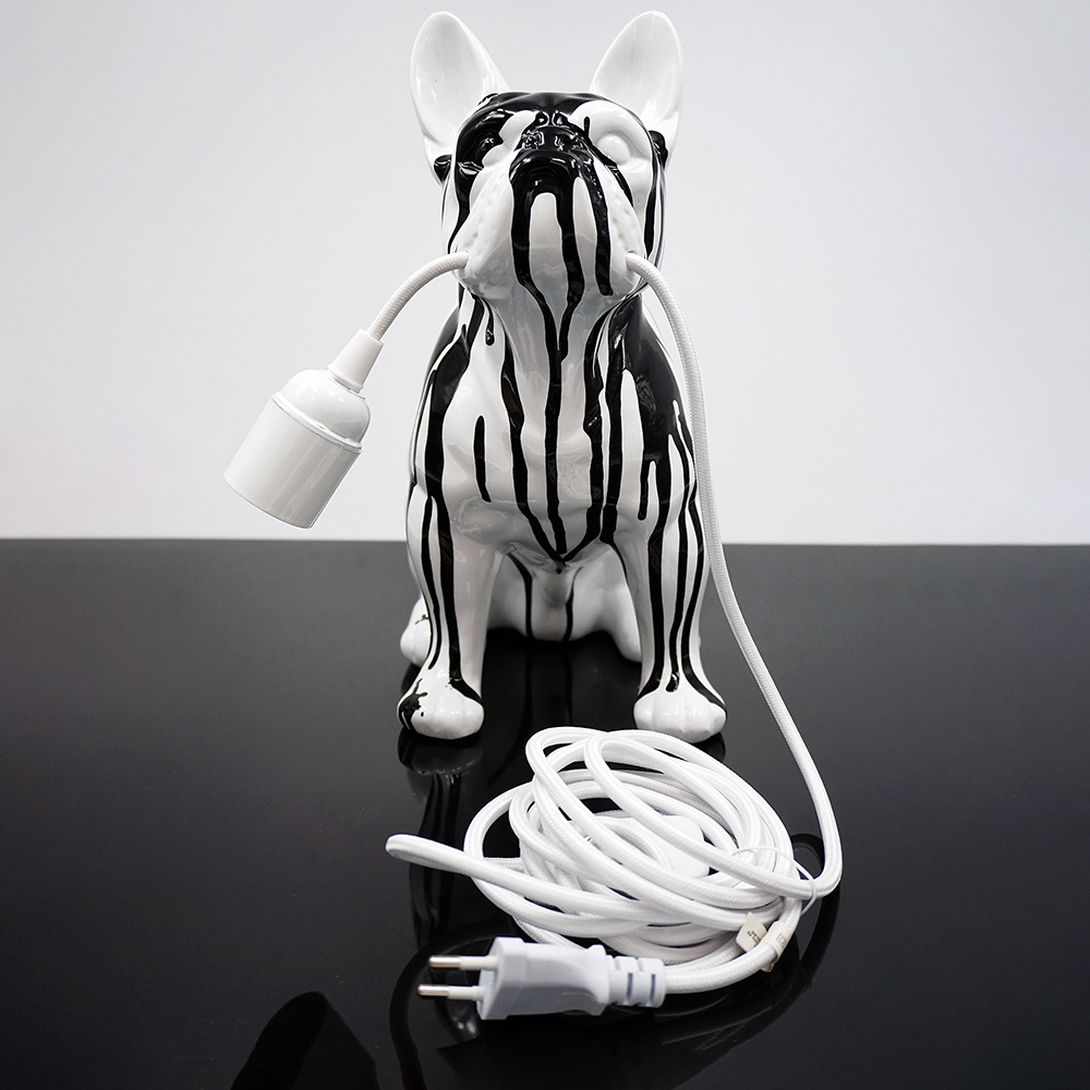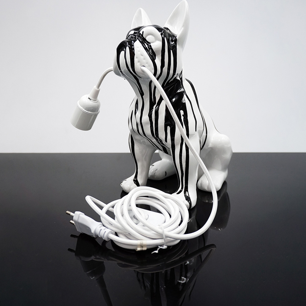 Figurine décorative blanche avec des accents noirs – lampe bulldog français avec un câble blanc.