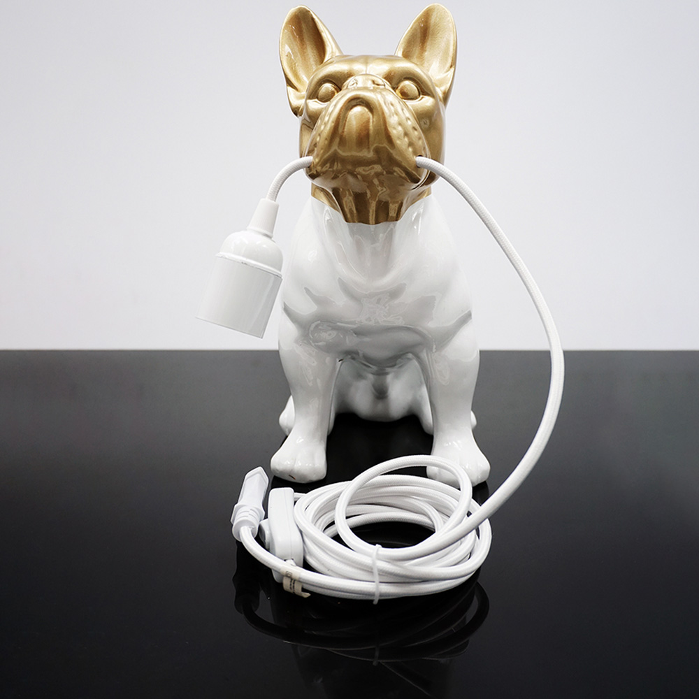 Figurine décorative blanche avec une tête dorée – lampe bulldog français avec un câble blanc.