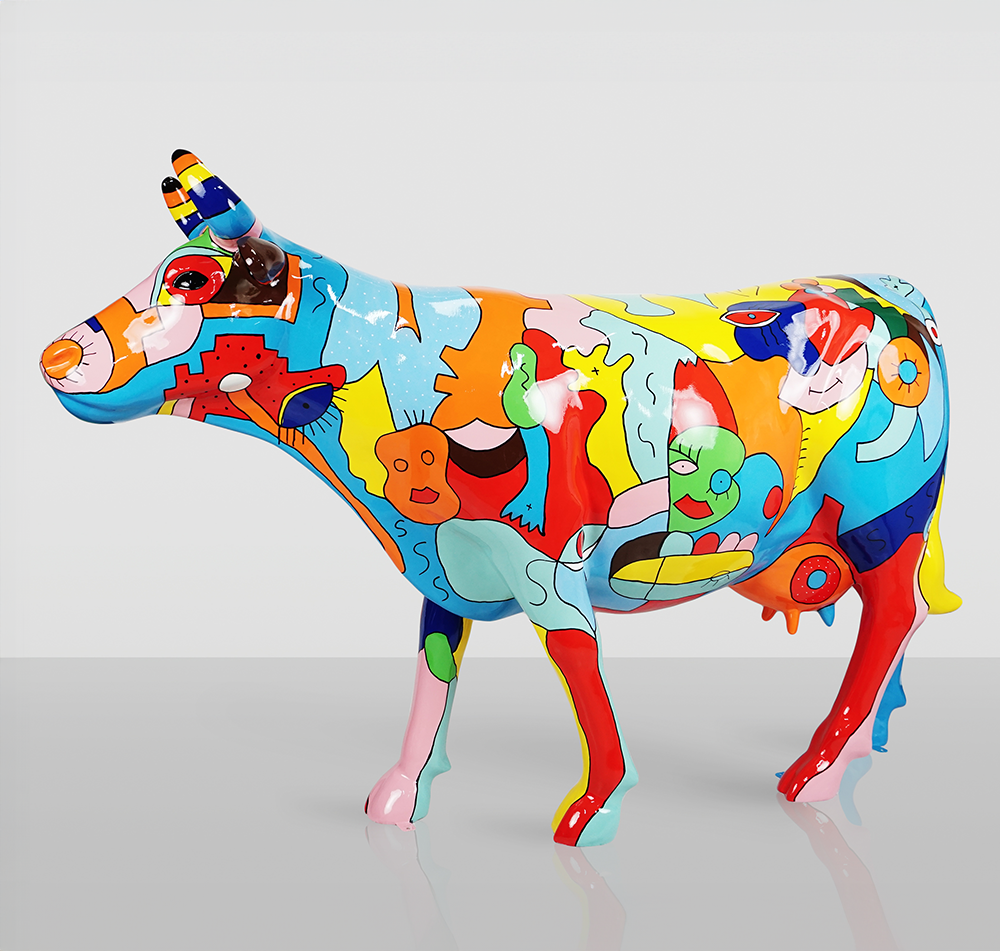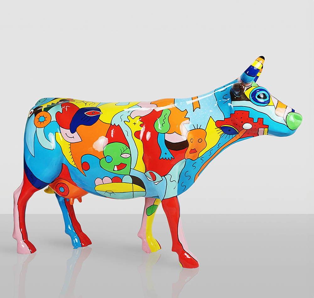 Chaque exemplaire est peint à la main, ce qui en fait une œuvre d’art unique en son genre. La vache se distingue par une riche palette de couleurs et des motifs abstraits qui peuvent rappeler les œuvres de Picasso – pleines d’expression et de couleurs, elles s’intègrent parfaitement dans des espaces modernes comme plus traditionnels.