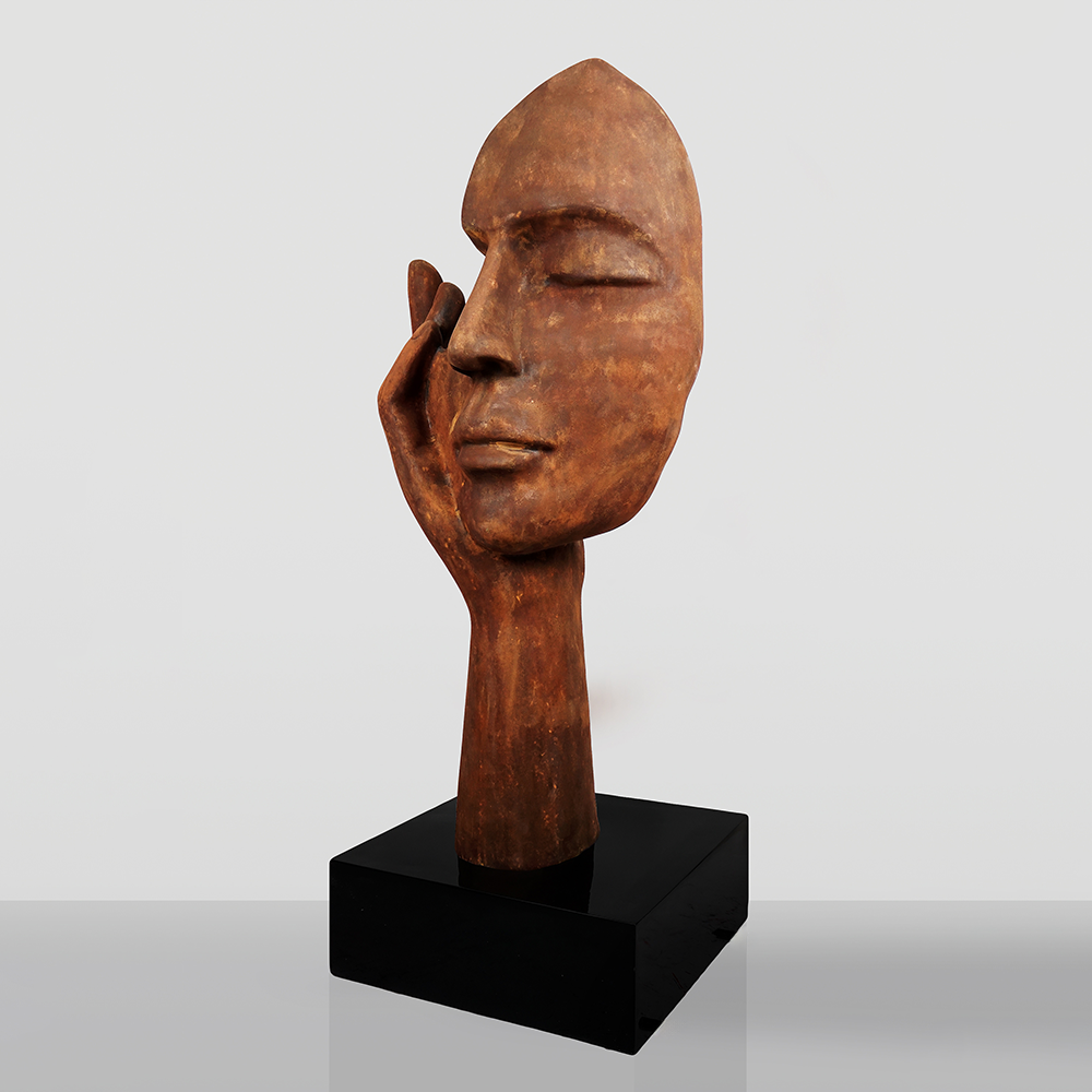 Sa forme unique, ressemblant à une main humaine avec un masque, symbolise la connexion entre émotions et expression. La finition dans des teintes rouillées lui confère un caractère industriel, s’intégrant parfaitement dans des aménagements modernes. La sculpture s’adapte parfaitement dans un bureau, une galerie d’art, ainsi que comme élément décoratif dans les maisons et jardins.
