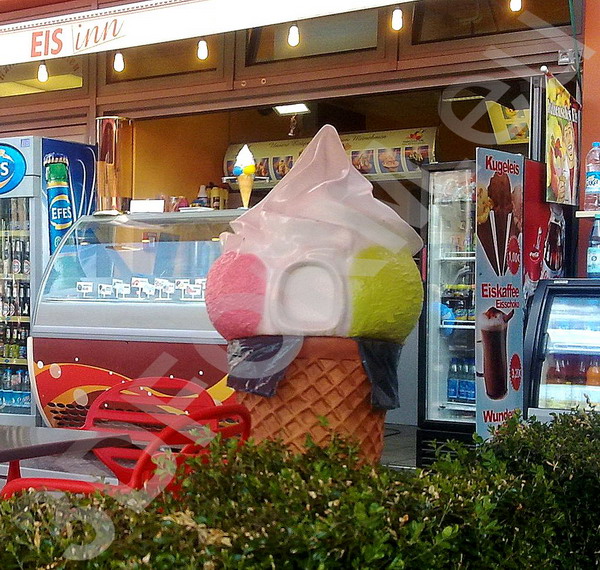 Reklama gastronomiczna, obiekt reklamowy w przestrzeni miejskiej, reklama lodów nad morzem, reklama dla lodziarni/kawiarni.